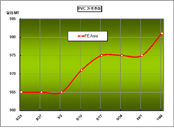 CFR China 960-980달러 수준에서 횡보 … 미국제품 유입이 문제 PVC 가격은 10월6일 CFR China 톤당 981달러로 6달러 상승했다.아시아 PVC(Polyvinyl Chloride) 가격은 WTI(서부텍사스 경질유)가 배럴당 82달러를 형성하며 고공행진을 지속하는 가운데 중국 국경절의 영향이 겹쳐 상승세를 지속했다. 중국 내수가격은 동부지역 기준 300위안 상승해 8400-8500위안을 형성했고, VCM(Vinyl Chloride Monomer)과 PVC의 스프레드는 톤당 150-180달러를 유지하고 있다.
