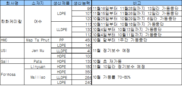 10월 LLDPE 이어 11월 LDPE 보수 … Formosa는 10월 가동률 70-80% 아시아 PE(Polyethylene) 플랜트의 정기보수가 잇따르고 있어 수급타이트가 예상되고 있다.한화케미칼은 여수 소재 LDPE(Low Density Polyethylene) No.1 9만6000톤을 11월16일부터 13일간, No.2 10만7000톤을 11월15일부터 12일간, No.3 12만톤을 10월25일부터 6일간 가동중단할 예정이다. 또 여수 소재 LLDPE(Linear LDPE) No.1 11만3000톤을 10월11일부터 8일간, No.2 13만톤을 10월4일부터 10일간, No.3 11만2000톤은 10월4일부터 8일간 가동중단하고 있다.