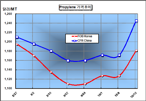 FOB Korea 1181달러로 54달러 급등 … 중국수요 증가세 전환으로 프로필렌 가격은 10월15일 FOB Korea 톤당 1181달러로 54달러 급등했다.아시아 프로필렌(Propylene) 시세는 나프타 가격이 770달러대로 강세를 보이고 중국수요가 다시 증가세로 돌아서면서 1200달러에 근접했다. 나프타 가격은 국제유가가 80달러대 초반의 강세를 지속함에 따라 773달러로 상승했다. 중국 역시 10월 1-7일 장기연휴가 끝나면서 동부지역을 중심으로 프로필렌 수요가 크게 증가해 아시아 가격 상승을 이끌었다.