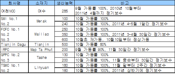 10월부터는 정기보수가 이어지고 있다. 여천NCC는 여수소재 28만5000톤 플랜트를 9월 풀가동했지만 10월부터 2011년 4월까지 정기보수에 들어갔다. IRPC도 Map Ta Phut 소재 20만톤 플랜트를 11월 중으로 30일간 정기보수를 실시하고, GPPC는 Tashe 소재 No.2 13만톤, No.3 20만톤 플랜트를 풀가동하고 있지만 No.3 플랜트는 11월 중순부터 30일간 정기보수할 예정이다. TSMC 역시 Linyuan 소재 No.1 18만톤, No.2 16만톤 플랜트를 100% 가동하고 있지만 No.1 플랜트는 11월말부터 2주간, No.2 플랜트는 2011년 상반기 중으로 정기보수할 예정이다. <박찬영 기자> 표, 그래프: | 아시아 SM 플랜트 가동현황(2010) | <화학저널 2010/10/19> |
