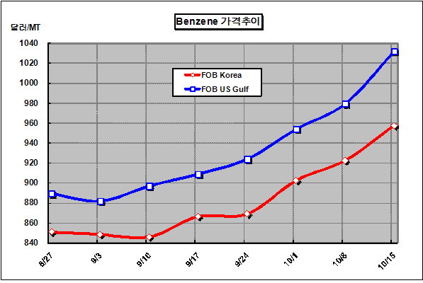 FOB Korea 958달러로 35달러 올라 … 미국가격은 1032달러 벤젠 가격은 10월15일 FOB Korea 톤당 958달러로 35달러 상승했다.아시아 벤젠(Benzene) 시세는 국제유가 강세가 지속되고 미국가격이 1000달러를 훨씬 넘어섬에 따라 900달러대 중반으로 강세를 계속했다. 국제유가는 뉴욕상업거래소에서 WTI(서부텍사스 경질유)가 82달러 후반으로 전주에 비해 1달러 정도 하락했으나 여전히 벤젠 가격 강세에 영향을 미치고 있다.