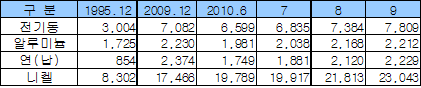 알루미늄은 중국의 알루미늄 생산 감소로 2.0% 오른 2212달러, 전기동은 달러화 약세 및 인디아 구리 제련소의 폐쇄, 지속적인 재고감소에 따른 수급타이트 지속 등의 영향이 겹쳐 5.8% 상승해 7809달러를 기록했다. <고우리 기자> 표, 그래프: | 비철금속 수입가격 변화(2010) | <화학저널 2010/10/20> |