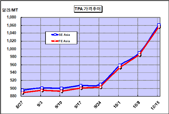 CFR FE China 1060-1062달러 형성 … 원료 P-X도 125달러 급등 PTA(Purified Terephthalic Acid) 가격이 면화가격 상승세에 힘입어 급등하고 있다.아시아 PTA 가격은 전주대비 71달러 급등해 CFR China 톤당 1061달러를 기록했다. 원료 P-X(Para Xylene) 가격도 급등세를 나타내고 있어 당분간 상승세가 이어질 것으로 보이는데 P-X 가격은 전주대비 124.5달러 급등해 FOB Korea 1227.5달러를 기록했다.