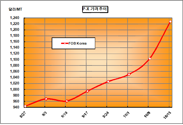 FOB Korea 1228달러로 120달러 상승 … 구매처 가격저항 감수록 심화 P-X(Para-Xylene) 가격이 1200달러를 돌파하며 끝없이 상승하고 있어 수요기업들의 가격저항이 심화되고 있다.아시아 P-X 가격은 45달러 상승해 FOB Korea 톤당 1227-1228달러를 형성했다. 특히, CFR Taiwan/China 가격은 톤당 1242달러로 가장 큰 상승폭을 기록했다. 쿠웨이트 P-X 생산기업이 불가항력을 선언함에 따라 P-X 83만톤과 벤젠(Benzene) 플랜트의 가동중단으로 수급차질이 예상되고 있기 때문이다. 시장에서는 CFR Taiwan/China 가격이 톤당 1255달러까지 상승할 것으로 예상하고 있어 구매기업의 가격저항이 심화되고 있다.