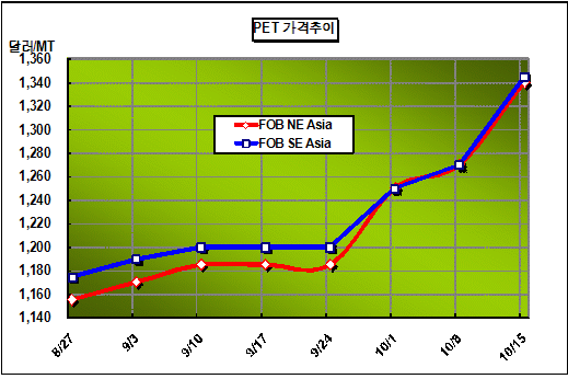 FOB NE Asia 1339-1341달러 형성 … PTAㆍMEG 강세에 거래중단 PET(Polyethylene Terephthalate) Bottle칩 가격이 무섭게 상승하고 있다.아시아 PET Bottle칩 가격은 FOB NE Asia 톤당 1341달러로 전주대비 75달러 급등했다. PTA(Purified Terephthalic Acid) 가격이 전주대비 84달러 상승해 톤당 1042달러로 강세가 지속하고 있기 때문이다. MEG(Monoethylene Glycol) 가격도 964달러로 전주대비 108달러 상승해 PET Bottle칩 시장의 불안요소로 작용하고 있다. 면화 가격과 폴리에스터(Polyester) 호조로 PTA와 MEG 가격이 덩달아 상승하고 있다.