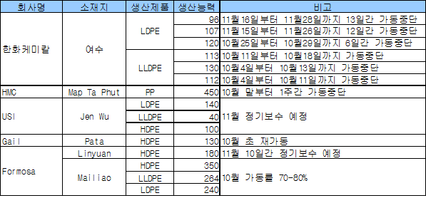 한화, 10-11월 67만8000톤 정기보수 … Formosa는 10월 가동률 70-80% 한화케미칼을 비롯해 아시아 폴리머 플랜트의 정기보수가 줄을 잇고 있다.한화케미칼은 여수 소재 No.1 LDPE(Low Density Polyethylene) 9만6000톤 플랜트를 11월16일부터 13일간, No.2 10만7000톤을 11월15일부터 12일간, No.3 12만톤을 10월25일부터 6일간 정기보수할 예정이다. 또 여수 소재 No.1 LLDPE(Linear LDPE) 11만3000톤을 10월11일부터 8일간, No.2 13만톤을 10월4일부터 10일간, No.3 11만2000톤은 10월4일부터 8일간 정기보수하고 있다.