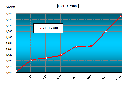 CFR FE Asia 1551달러로 51달러 올라 … 수급타이트에 정기보수도 LDPE 가격은 10월20일 CFR FE Asia 톤당 1551달러로 51달러 급등했다.아시아 LDPE(Low-Density Polyethylene) 시세는 국제유가가 하락세로 전환됐음에도 불구하고 원료코스트가 강세를 보이고 있는 영향으로 1500달러대 중반으로 올라섰다. 원료 에틸렌(Ethylene) 가격은 FOB Korea 톤당 1051달러로 68달러 급락했으나 전주에는 1119달러로 1100달러를 넘어섰기 때문이다.