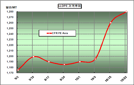 CFR FE Asia 1280달러로 20달러 올라 … 타이 40만톤 가동 지연 LLDPE 가격은 10월20일 CFR FE Asia 톤당 1280달러로 20달러 상승했다.아시아 LLDPE(Linear Low-Density Polyethylene) 시세는 공급이 제한적인 가운데 수요기업들의 주문이 몰려 5월 이후 최고수준을 형성했다. 중동산은 CFR China 톤당 1290-1300달러에도 거래된 것으로 알려졌다.