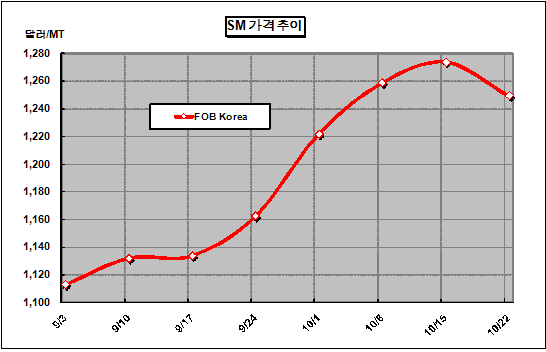 FOB Korea 1249달러로 25달러 떨어져 … 중국 내수가격은 상승 SM 가격은 10월22일 FOB Korea 톤당 1249달러로 25달러 하락했다.아시아 SM(Styrene Monomer) 시세는 국제유가가 배럴당 80달러 수준으로 떨어짐에 따라 벤젠(Benzene)이 톤당 950달러 후반으로 강세를 보였음에도 불구하고 하락세로 전환됐다. 반면, 중국 내수가격은 50-100톤의 소량 거래에서 40위안 올라 1만100-1만150위안으로 수입가격 기준 1269- 1275달러를 형성했다.