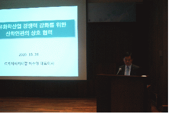 허수영 사장, 화학산업 심포지엄에서 지적 … 선진기술 모방이 한계점 석유화학산업의 경쟁력 강화를 위한 산학연관의 상호협력이 난항을 겪고 있다.10월28일 한국화학관련학회연합회 주최로 서울 신라호텔 토파즈홀에서 열린 <제10회 화학산업진흥심포지엄>에서 KP케미칼 허수영 사장은 산학연관의 협력이 쉽지 않다고 지적했다. 허수영 사장은 <석유화학산업 경쟁력 강화를 위한 산학연관의 상호 협력> 주제 발표를 통해 “국내 석유화학 시장은 범용제품 비중이 크고 정밀화학 및 EP(Engineering Plastics), 첨단 신소재는 선진국과의 격차가 크다”며 “생산공정에 대한 원천기술이 부족하고, 베이직 디자인 능력이 떨어지며 관련특허가 미비하다”고 문제점을 지적했다.