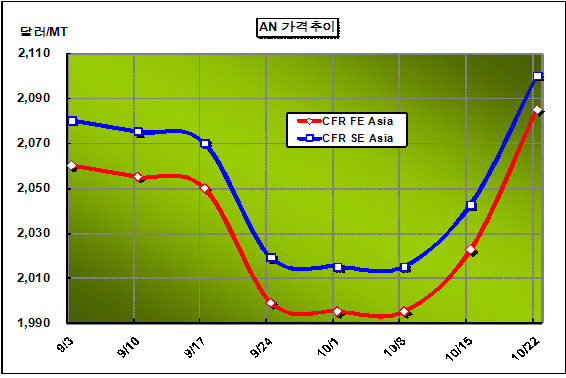 CFR FE Asia 2085달러로 61달러 올라 … 면화 흉작이 결정타 AN 가격이 섬유 수요 호조로 수급타이트 현상이 나타나며 급등세를 나타냈다.아시아 AN(Acrylonitrile) 가격은 10월19일 전주대비 61달러 상승해 CFR FE Asia 톤당 2084-2086달러를 형성했다. 동남아 역시 57달러 상승해 CFR SE Asia 톤당 2099-2101달러를 기록했다. 면화 흉작으로 합성섬유 수요가 호조를 보이며 아크릴섬유(Acrylic Fiber)에 사용되는 AN 수요가 폭증하고 있으며, 아시아 지역의 정기보수로 수급타이트가 겹치고 있기 때문이다. Asahi Kasei는 Kawasaki 소재 AN 15만톤 플랜트를 10월1일부터 11월10일까지 정기보수하면서 Mizushima 소재 MAN(Meta-Acrylonitrile) 10만톤 플랜트를 AN 병산으로 전환해 수요증가에 대응하고 있다. Dia-Nitrix는 9월 말부터 11월 초까지 Otake 소재 9만톤 플랜트를 가동중단하고 있다.