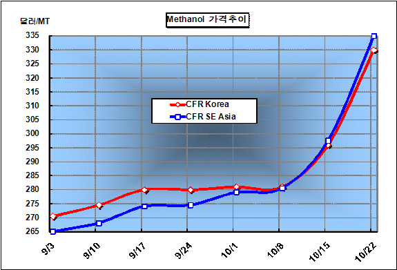 CFR Korea 330달러로 34달러 올라 … 중국 동부지역은 368달러 메탄올 가격은 10월22일 CFR Korea 톤당 330달러로 34달러 상승했다.아시아 메탄올(Methanol) 시세는 중국 수요가 크게 증가하면서 전주 15달러 상승에 이어 300달러까지 돌파해 최근 2년 동안 최고가격을 형성했다. 중국은 장기간의 국경절 연휴 이후 포름알데히드(Formaldehyde), 가솔린 블렌딩, MTBE(Methyl Tertiary Butyl Ether), DME(Dimethyl Ether) 제조용 메탄올 수요가 크게 증가하고 있다.