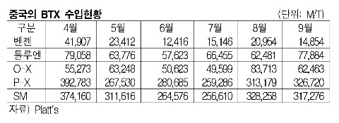중국, 벤젠ㆍO-X 수입 증감 반복 … 한국의 O-XㆍSM 수출은 증가 중국의 아로마틱 수입이 들쑥날쑥 형태를 보이고 있다.벤젠(Benzene), O-X(Ortho-Xylene), SM(Styrene Monomer)은 증감을 계속한 반면, P-X(Para-Xylene)는 유일하게 PTA(Purified Terephthalic Acid) 호조로 꾸준히 증가세를 나타냈다.
