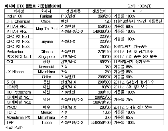 JX Nippon 가동률 85% … KP케미칼은 85%에서 75%로 하향조정 아시아 BTX 플랜트의 가동률이 낮아지기 시작했다.2010년 3/4분기까지는 대부분의 플랜트가 90%를 상회했으나 몇몇 아시아 BTX 플랜트의 가동률이 낮아지고 있어 일부에서는 가동률 조정으로 강세를 유발시키는 것이 아니냐는 관측을 제기하고 있다. JPE Chemical은 Chiba 소재 벤젠(Benzene) 12만톤 플랜트를 11월18일까지 1달간 가동중단할 예정이며, JX Nippon은 Kawasaki 소재 P-X(Para-Xylene) 35만톤, Mizushima 소재 25만톤, Kashima 소재 17만톤 플랜트의 가동률을 85%로 유지하고 있다.