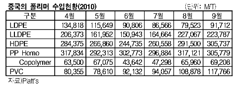 9월 LLDPE 17%에 PVC 무려 39% 줄어 … 전체 수입도 주춤 3/4분기 들어 회복되는 양상을 나타냈던 중국의 폴리머 수입이 9월에는 주춤한 양상을 보이고 있다.LLDPE(Linear Low-Density Polyethylene)는 8월 22만7067톤으로 전월대비 37.9% 증가했지만, 9월에는 22만3687톤으로 1.4% 감소했다. 국내 수출 역시 8월 2만6176톤에서 9월 2만1725톤으로 17.0% 감소했다.