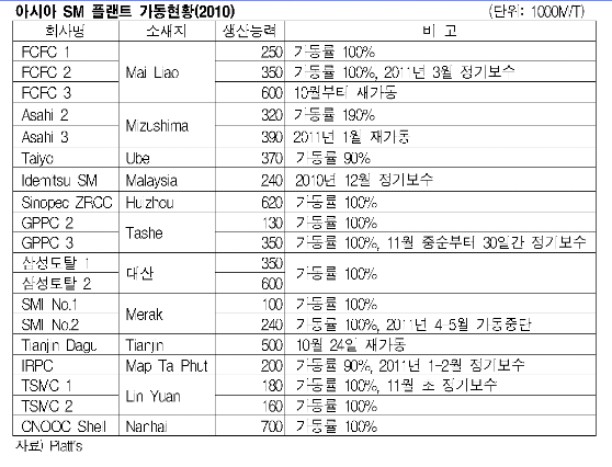 삼성토탈ㆍSMI 100% 가동 … 2011년 봄 정기보수 많아 변수 아시아 SM(Styrene Monomer) 시장의 공급과잉 상태가 계속되고 있다.대부분의 SM 플랜트 가동률이 95%를 넘어서며 풀가동에 가까워지고 있기 때문이다. 중국 Sinopec ZRCC를 비롯해 삼성토탈, SMI, GPPC, FCFC 등은 SM 플랜트의 가동률을 100% 수준에서 유지하고 있다. SM 가격이 강세를 보여 수익성이 양호하기 때문이다.