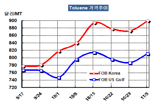 FOB Korea 899-900달러 형성 … 5월 이후 가장 큰 상승폭 기록 톨루엔(Toluene) 가격이 900달러를 돌파했다.아시아 톨루엔 가격은 11월5일 전주대비 27달러 상승해 FOB Korea 톤당 899-900달러를 형성했다. 특히, 톨루엔 가격은 국제유가가 4.43달러 상승해 배럴당 85.93달러로 상승한데 힘입어 5월 이후 가장 큰 상승폭을 기록했다. 시장에서는 톨루엔 가격이 상승함에 따라 톤당 900-910달러 사이에도 거래되고 있는 것으로 나타났다.