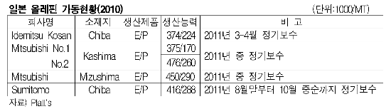 Idemitsu 3-4월에 Sumitomo 8-10월 … Mitsubishi는 3개 일정 미정 2011년 일본의 올레핀 정기보수가 분산돼 시장에 미치는 영향이 크지 않을 전망이다.일본 올레핀 시장은 2010년 말까지 가동중단 및 정기보수가 없어 수급이 원활했고, 2011년 상반기에도 정기보수가 많지 않아 수급밸런스가 예상된다.