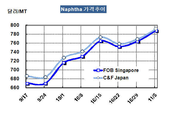 유럽의 나프타 가격도 CIF ARA 톤당 776달러로 상승했다. 유럽에서는 석유화학기업들이 나프타 구매에 적극 나서지 않고 있어 다시 하락세로 전환될 것이 확실시되고 있다. 표, 그래프: | Naphtha가격추이 | <화학저널 2010/11/12> |