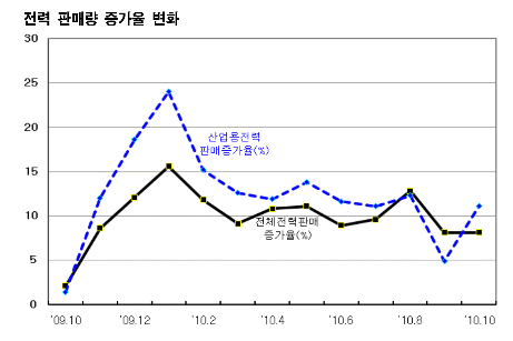지경부, 10월 전력 판매량 소폭 증가 … 산업용 수요는 급증세 10월 산업용 전력판매량이 크게 증가했으나 정유 및 화학제품 제조용 전력 수요는 소폭 증가에 그친 것으로 나타났다.
