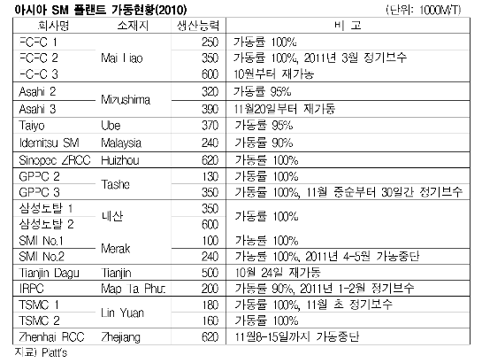 2011년 상반기를 기점으로 생산기업들의 가동중단이 이어지는 가운데 원료 가격도 강세를 보이고 있기 때문이다. SMI는 Merak 소재 No.2 20만톤 플랜트를 2011년 4-5월에, FCFC는 No.2 35만톤 플랜트를 2011년 3-4월에 정기보수할 것으로 알려졌다. <복혜미 기자> 표, 그래프: | 아시아 SM 플랜트 가동현황(2010) | <화학저널 2010/11/18> |