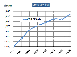CFR FE Asia 1645달러로 30달러 올라 … 1700달러 도달은 무리 LDPE 가격은 11월24일 CFR FE Asia 톤당 1645달러로 30달러 상승했다.아시아 LDPE(Low-Density Polyethylene) 시세는 세계적으로 수급타이트가 지속되면서 PE의 하락세 전환을 뒤로 하고 다시 상승모드로 돌아섰다. 특히, 동남아에서는 12월 공급물량이 CFR SE Asia 톤당 1720달러까지 거래된 것으로 알려졌다.