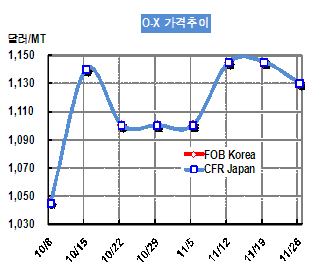 FOB Korea 1130달러로 15달러 하락 … 재고수준 낮아 상승 여지도 O-X 가격이 하락세로 반전했다.아시아 O-X(Ortho-Xylene) 가격은 11월26일 FOB Korea 톤당 1131달러로 전주대비 15달러 하락했다. 원료인 isomer M-X(Mixed Xylene) 가격이 36달러 하락했고, 다운스트림 PA(Phthalic Anhydride)도 약세를 보이고 있기 때문이다. 여기에 수요기업들의 구매의지도 톤당 1100달러에서 움직이고 있어 실제 거래가 미미한 것으로 나타났다. 하지만, 시장에서는 재고수준이 충분치 않아 조만간 가격이 재상승할 것이라는 의견이 지배적이다.