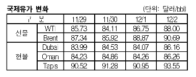 Brent, 12월2일 1.82달러 올라 90.69달러 … WTIㆍ두바이유도 급등 12월2일 국제유가는 경기회복 기대감에 따른 미국증시 상승 및 달러화 약세 등의 영향으로 상승했다.한국석유공사에 따르면, 뉴욕상업거래소(NYMEX)의 WTI(서부텍사스 경질유) 선물유가는 88.00달러로 1.25달러, 런던석유거래소(ICE)의 Brent 선물유가는 90.96달러로 1.82달러 상승했다. 두바이(Dubai) 현물유가도 주요국 경기지표 개선 소식에 따른 미국증시 상승 및 달러화 약세 등의 영향이 뒤늦게 반영돼 2.09달러 상승한 86.16달러에 거래를 마감했다.