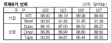 WTI, 12월7일 0.69달러 내려 88.69달러 형성 … 두바이ㆍBrent유도 하락 12월7일 국제유가는 미국 정부의 감세정책 연장 발표에 따른 경기회복 기대감에도 불구하고 달러화 가치 상승하면서 하락했다.한국석유공사에 따르면, 뉴욕상업거래소(NYMEX)의 WTI(서부텍사스 경질유) 선물유가는 88.69달러로 0.69달러, 런던석유거래소(ICE)의 Brent 선물유가는 91.39달러로 0.06달러 내렸다. 두바이(Dubai) 현물유가도 전일대비 0.25달러 하락한 88.27달러에 거래를 마감했다.