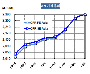 아시아 AN(Acrylonitrile) 가격은 11월30일 전주대비 25달러 상승해 CFR FE Asia 톤당 2289-2291달러를 형성했다. 10주 연속 상승한 것이다.