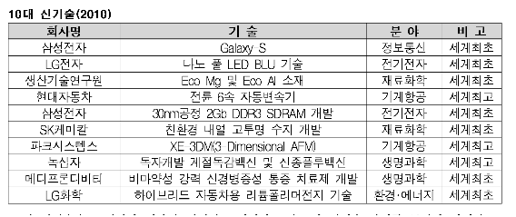 2010년에 선정된 10대 신기술의 2011년 매출은 9조9000억원에 이를 것으로 예상되고 있다. <고우리 기자> 표, 그래프: | 10대 신기술(2010) | <화학저널 2010/12/10> |