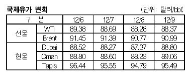 WTI, 12월9일 0.09달러 올라 88.37달러 … 두바이유는 88.80달러 12월9일 국제유가는 경기지표 호전 및 정유설비 가동차질의 영향으로 상승했다.한국석유공사에 따르면, 뉴욕상업거래소(NYMEX)의 WTI(서부텍사스 경질유) 선물유가는 88.37달러로 0.09달러, 런던석유거래소(ICE)의 Brent 선물유가는 90.99달러로 0.22달러 올랐다. 두바이(Dubai) 현물유가도 전일대비 1.43달러 오른 88.80달러에 거래를 마감했다.