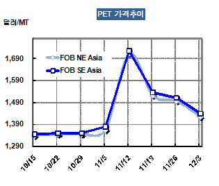 FOB NE Asia 1425달러로 70달러 떨어져 … 아시아 가동률 조정 불가피 PET(Polyethylene Terephthalate) 칩 가격 하락세가 계속되고 있다.아시아 PET칩 가격은 12월1일 FOB NE Asia 톤당 1426달러로 전주대비 70달러 하락했다. 중국 폴리에스터(Polyester) 시장이 전반적으로 부진한 상태에서 원료인 PTA(Purified Terephthalic Acid)와 MEG(Monoethylene Glycol) 가격이 약세를 보이고 있기 때문이다. PTA 가격은 CFR China 톤당 1150달러로 22달러 하락했으며, MEG는 22달러 하락해 CFR China 톤당 996달러를 형성했다.