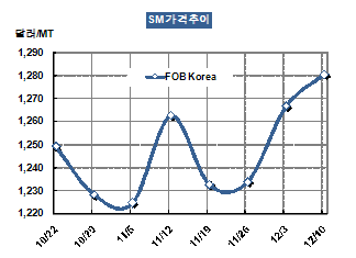 FOB Korea 1281달러로 14달러 상승 … 중국 수입수요 감소 SM 가격은 12월10일 FOB Korea 톤당 1281달러로 14달러 상승했다.아시아 SM(Styrene Monomer) 시장은 전반적으로 침체되는 모습을 보이고 있으나 주말이 다가오면서 극동을 중심으로 약상승으로 전환됐다. 그러나 아시아 시장 전반에서 수요가 늘어나지 않고 있어 불안한 상태를 보이고 있다.