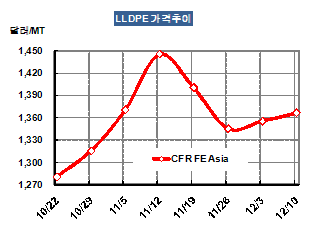 CFR FE Asia 1366달러로 11달러 상승 … 유가 강세에 구매 지연 LLDPE 가격은 12월8일 CFR FE Asia 톤당 1366달러로 11달러 상승했다.아시아 LLDPE(Linear Low-Density Polyethylene) 시세는 국제유가가 전주대비 3달러 상승해 배럴당 87달러에 육박함에 따라 2주 연속 상승했다. Dalian Commodity Exchange 시장의 선물가격 약세 영향으로 수요처들이 구매 시기를 늦춘 것도 큰 영향을 미치지 못했다. 반면, 중국 정부가 지급준비율을 인상하는 등 금융압박을 강화하면서 2011년 전망이 불투명해짐에 따라 중국의 LLDPE 12월 도착물량은 전주대비 35위안 하락해 1만560위안을 형성했다.