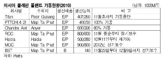 Haldia Petrochemical 등도 정기보수를 마치고 재가동에 돌입했다. MOC는 Map Ta Phut 소재 에틸렌 90만톤, 프로필렌 80만톤 크래커의 정기보수 일정이 2012년까지 전무해 2011년 아시아 올레핀 시장은 공급과잉 가능성이 높아지고 있다. <복혜미 기자> 표, 그래프: | 아시아 올레핀 플랜트 가동현황(2010) | <화학저널 2010/12/16> |
