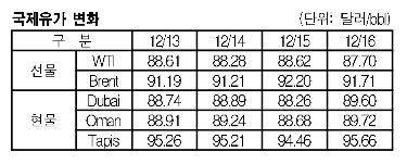 12월16일 1.34달러 올라 89.60달러 형성 … WTIㆍBrent유는 하락 12월16일 국제유가는 스페인 신용등급 하향조정 전망 등 유럽 재정위기 우려로 하락했다.한국석유공사에 따르면, 뉴욕상업거래소(NYMEX)의 WTI(서부텍사스 경질유) 선물유가는 87.70달러로 0.92달러, 런던석유거래소(ICE)의 Brent 선물유가는 91.71달러로 0.49달러 하락했다. 두바이(Dubai) 현물유가는 미국의 원유 재고 감소 및 경기지표 개선 등의 영향이 뒤늦게 반영돼 1.34달러 하락한 89.60달러에 거래됐다.
