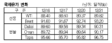 12월21일 0.97달러 올라 90.31달러 형성 … WTI는 89.82달러 그쳐 12월21일 국제유가는 미국의 소비 증가 및 주가 강세 등의 영향으로 상승했다.한국석유공사에 따르면, 뉴욕상업거래소(NYMEX)의 WTI(서부텍사스 경질유) 선물유가는 89.82달러로 0.45달러, 런던석유거래소(ICE)의 Brent 선물유가는 93.20달러로 0.46달러 올랐다. 두바이(Dubai) 현물유가는 경기회복 기대 및 북반구의 한파 소식 등이 뒤늦게 반영돼 0.97달러 상승한 90.31달러에 거래됐다.