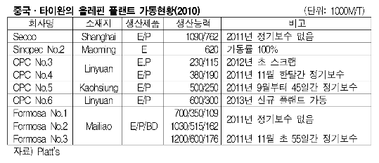 Formosa도 Mailiao 소재 No.1 에틸렌 70만톤, 프로필렌 35만톤, 부타디엔 10만9000톤 및 No.2 에틸렌 103만톤, 프로필렌 51만5000톤, 부타디엔 16만2000톤의 정기보수 계획이 없는 것으로 나타났다. 한편, Sinopec Maoming Petrochemical은 Maoming 소재 에틸렌 62만톤 크래커의 가동률을 100%로 끌어올린 것으로 알려졌다. <유현석 기자> 표, 그래프: | 중국ㆍ타이완의 올레핀 플랜트 가동현황(2010) | <화학저널 2010/12/23> |