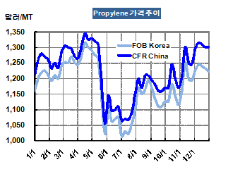 타이완 Formosa의 RFCC가 화재사고로 가동을 중단해 동아시아의 프로필렌 수급이 타이트해지고 중국의 PP 수입수요가 증가했기 때문이다. 국제유가가 배럴당 80달러를 넘어서면서 제조코스트가 상승한 것도 영향을 미쳤으며, 10월 이후에도 강세가 꺾이지 않아 Formosa의 재가동도 별 영향을 미치지 못했다. 2011년에는 국제유가가 초강세를 지속해 프로필렌도 1200달러 안팎을 유지할 것으로 예상되나 동아시아 크래커의 정기보수가 적어 7-8월에는 1000달러가 무너질 가능성도 엿보이고 있다. 1월에는 정기보수를 위해 11월 초 가동을 중단했단 타이완 CPC의 No.4 크래커(프로필렌 생산능력 19만3000톤)가 가동을 재개했고, 타이 Rayong Olefins도 프로필렌 생산능력 60만톤의 스팀 크래커를 재가동해 1200달러 붕괴가 예고되고 있다. 표, 그래프: | Propylene가격추이 | <화학저널 2011/01/04> |