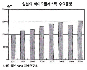 PLA에서 비가식 원료로 이동 … 석유계에서 식물유래로 대체 가속화 일본의 바이오플래스틱 수요는 2010년 1만5460톤으로 전년대비 12.9% 증가한 것으로 추정된다.기존 수요가 회복세를 보이고 있으며 비내열성 투명용기 등 특정 분야의 수요 확대와 신제품 개발이 활발해지고 있기 때문이다.