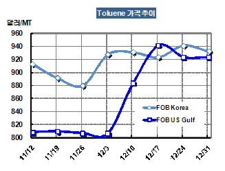 아시아 톨루엔 가격은 12월30일 전주대비 9달러 하락해 FOB Korea 톤당 931-932달러를 형성했다.