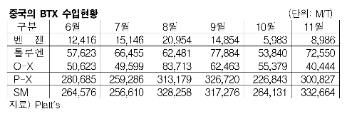 11월 벤젠ㆍSMㆍP-X 급증 … 정기보수 대비 구매 확대 중국의 아로마틱 수입이 증가세를 이어가고 있다.2010년 11월에는 벤젠(Benzene)을 비롯해 P-X(Para-Xylene) 등 BTX 전반의 수입량이 10% 이상 증가한 것으로 나타났다. 계절적 비수기임에도 불구하고 중국 수요기업들이 BTX 플랜트의 정기보수에 따른 수급차질 가능성에 대비하기 위해 적극 구매에 나서고 있기 때문이다. 특히, P-X은 BTX 가운데 33% 상승하며 가장 큰 수입량 증가폭을 나타냈다. P-X는 6월 28만685톤에서 8월 31만3179톤, 9월 32만6729톤으로 증가한 후 10월 들어 원료가격 상승으로 수요기업들의 구매가 주춤해짐에 따라 22만6843톤으로 50% 이상 급감했으나 11월에는 30만827톤으로 전월대비 33% 급증했다. 수요기업들이 P-X 정기보수에 따른 수급차질에 대비해 구매를 늘리고 있기 때문이다.