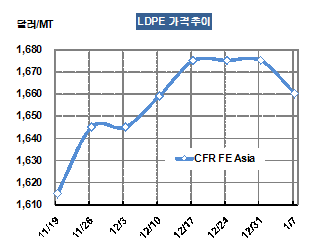 LDPE 가격은 1월5일 CFR FE Asia 톤당 1660달러로 15달러 하락했다.