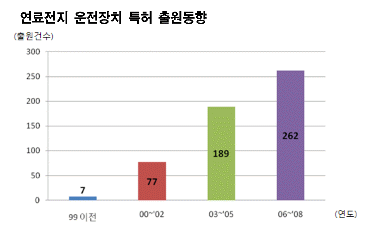 특허청, 2003-08년 출원건수 8% 증가 … 2015년 자동차 보급화 세계 각국의 환경규제 및 석유자원 고갈에 대비해 그린자동차 개발 경쟁이 가속화되는 가운데 유해가스와 이산화탄소(CO2)를 발생시키지 않거나 발생량이 적은 자동차로 연료전지 자동차, 전기자동차(EV), 하이브리드 자동차(HEV)가 주목받고 있다.특히, 연료전지는 연료의 화학에너지를 전기에너지로 직접 바꾸기 때문에 에너지 변환단계가 줄어 효율이 높아지기 때문에 자동차용 외에 선박용, 가정용 및 발전용으로 적용범위가 확대되고 있다.