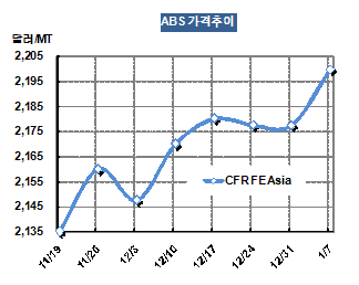 아시아 ABS(Acrylonitrile Butadiene Styrene) 가격은 수요기업들이 구정연휴 이후로 거래를 미루려는 움직임에도 불구하고 원료가격이 상승으로 강세가 이어지고 있다.