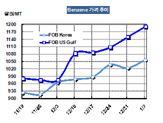FOB Korea 1056달러로 32달러 올라 … 여천NCC 4월 20만톤 보수 벤젠 가격은 1월7일 FOB Korea 톤당 1056달러로 32달러 상승했다.아시아 벤젠(Benzene) 시세는 북미 가격이 1200달러에 육박한 영향을 받아 하락한 지 1주일만에 상승세로 전환됐다. 미국가격은 FOB US Gulf 갤런당 397센트로 톤당 1191달러를 형성했는데, WTI(서부텍사스 경질유) 가격이 배럴당 88달러 수준으로 2달러 정도 떨어짐으로써 하락세 전환이 불가피해지고 있다. 중국 Sinopec이 북부지역 공급가격을 ex-tanks 톤당 7500위안으로 100위안(15달러) 인상한 것도 영향을 미쳤다.