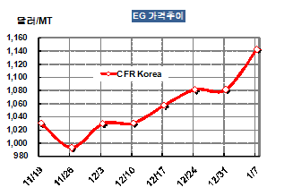 CFR China 1142달러로 61달러 급등 … 중국 긴축금융 정책 주목 MEG 가격은 1월7일 CFR China 톤당 1142달러로 61달러 급등했다.아시아 MEG(Monoethylene Glycol) 시세는 중국의 폴리에스터(Polyester) 판매가 높은 수준을 유지함에 따라 수급타이트가 지속돼 1140달러까지 넘어섰다. 그러나 1월6일 1151달러에 비해서는 9달러 떨어져 상승세에 브레이크가 걸린 것으로 판단되고 있다.