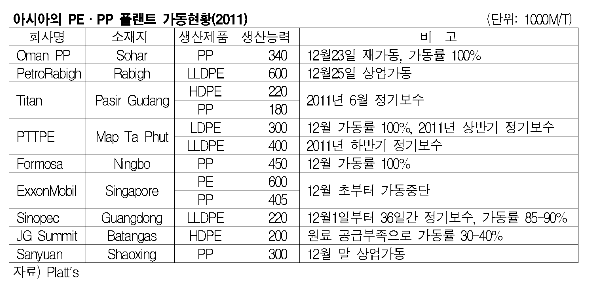 정기보수 완료에 신규 플랜트 가동까지 … 정기보수 별로 없어 아시아 폴리머 가동률은 2010년 12월 말부터 향상되고 있어 2011년 상반기에는 수급타이트가 완화될 것으로 예상된다.Oman PP는 12월23일부터 Sohar 소재 PP(Polypropylene) 34만톤 플랜트를 100%로 재가동하고 있고, 타이완 Formosa는 Ningbo 소재 PP 45만톤 플랜트를 풀가동하고 있는 것으로 알려졌다. PetroRabigh는 Rabigh 소재 LLDPE(Linear Low-Density Polyethylene) 60만톤을 12월25일부터, Sanyuan은 Shaoxing 소재 PP 30만톤 플랜트를 12월 말부터 상업가동에 들어갔다.