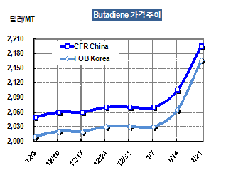 FOB Korea 2165달러로 100달러 올라 … 천연고무 강세 지속 초강세 부타디엔 가격은 1월21일 FOB Korea 톤당 2165달러로 100달러 폭등했다.아시아 부타디엔(Butadiene) 시세는 미국수출이 갑자기 증가하면서 수급타이트로 전환돼 2000달러대 초중반의 장기 안정세에서 벗어났다. 특히, 1월 말에서 2월 초에 미국으로 수출되는 1000톤은 FOB Korea 톤당 2045달러를 나타냈으나 일본산 1200톤은 CFR Korea 톤당 2235달러에 거래됐다.